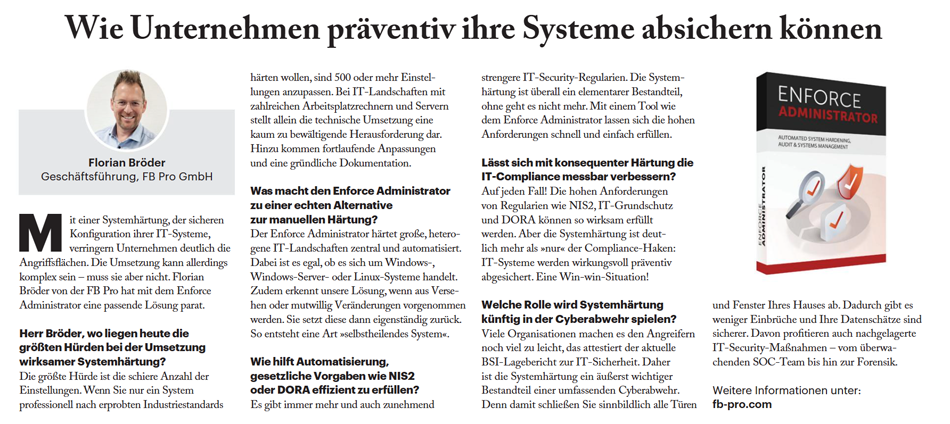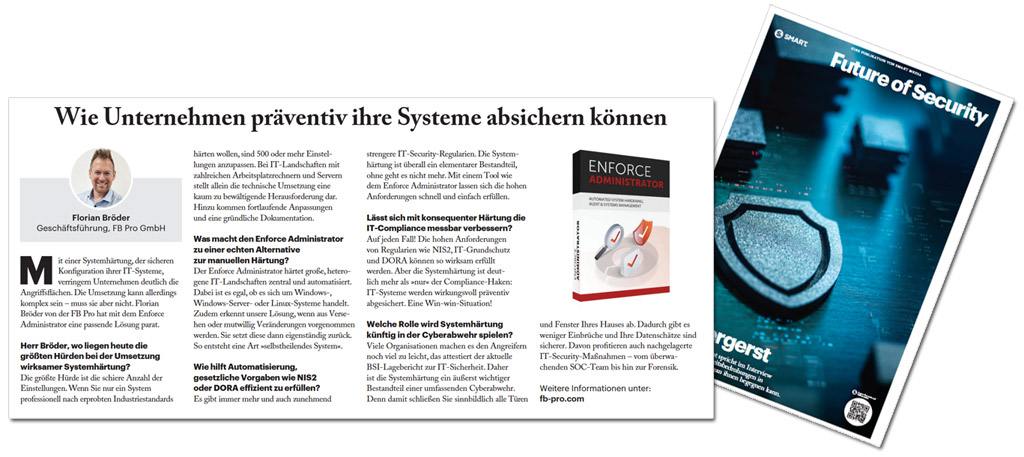 Florian Bröder, Geschäftsführer der FB Pro, beschreibt im Interview mit dem Print- und Online-Magazin „Smart Future of Security“ genau diese Pain Points. Er zeigt auch auf, warum viele Unternehmen trotz bester Absichten an ihren Hardening-Prozessen scheitern.